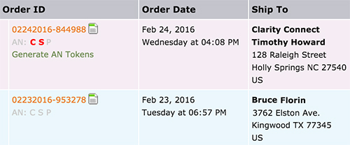 If all of the letters are grey (see second order at the left), everything is in place to capture your funds via the 'Make Payment' button. If any of the token letters are red (see first order at right), there will be a link to Generate AN Tokens. You can click this to regenerate the tokens prior to capturing your funds.