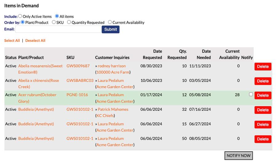 When you have updated your inventory, you can click on Notify Customers of Items Back In Stock to send emails to all customers to notify them that the plant or product SKU they were interested in is back in stock and available for purchase. If you like, the system can be programmed to check inventory each night and compare it to the 'Get Notified' requests and automatically send out an email to the 'requesters'. Once the email is sent, that requester will be removed from the list so they will not receive future notifications.