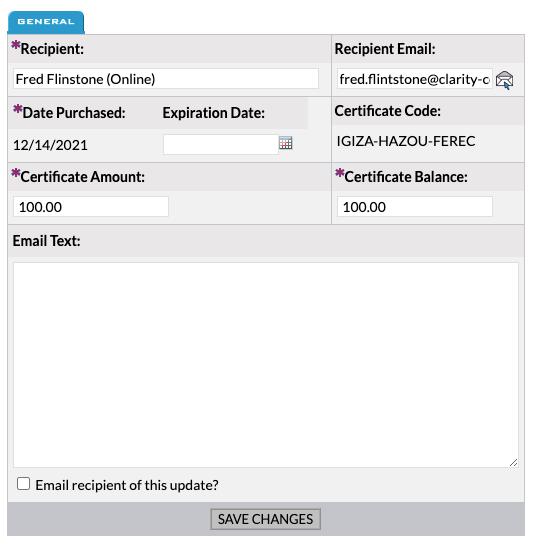 With your Gift Certificate Editor in your Clarity Console, you will be able to see details for all of the issued gift certificates including seeing the open balance and making any necessary changes to that value. You can also create a new gift certificate manually in the tool.