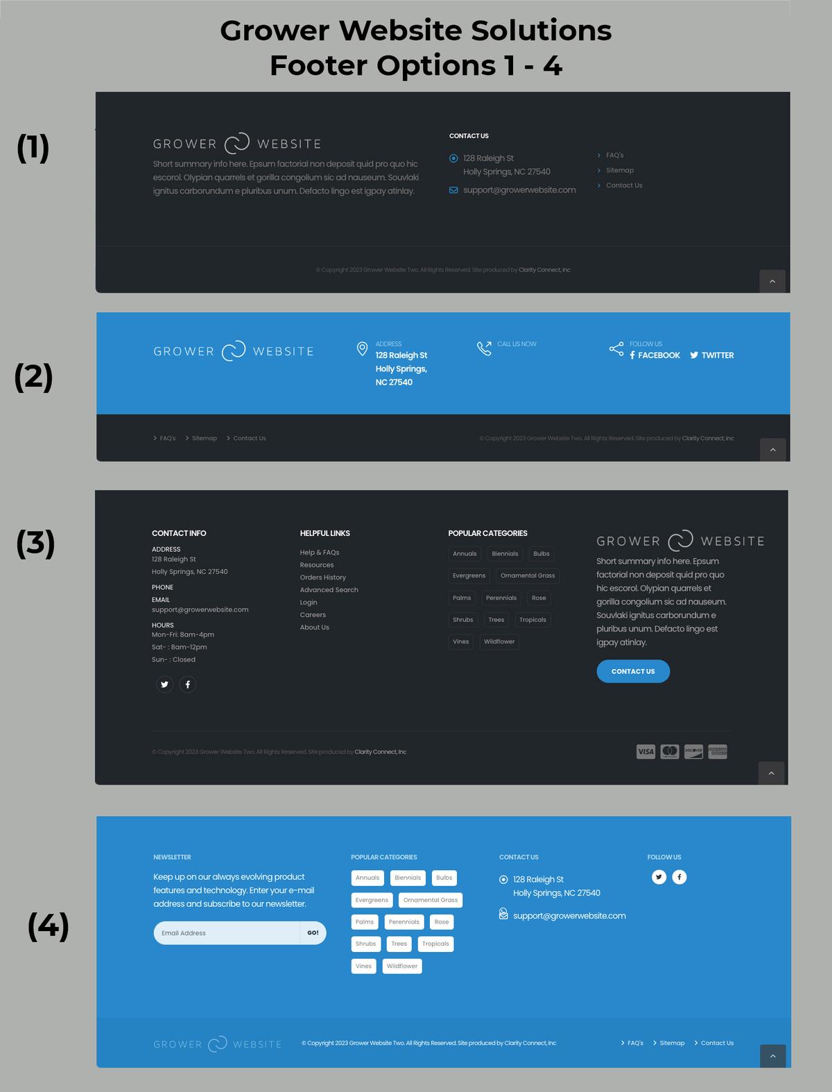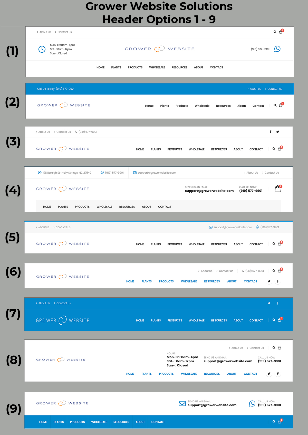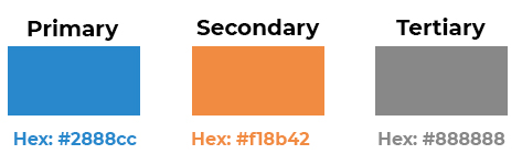 All of the header and footer examples shown at the left use this color scheme. Your website would reflect your colors. For example, if forest green is your primary, it would replace the sky blue color in all of the examples.