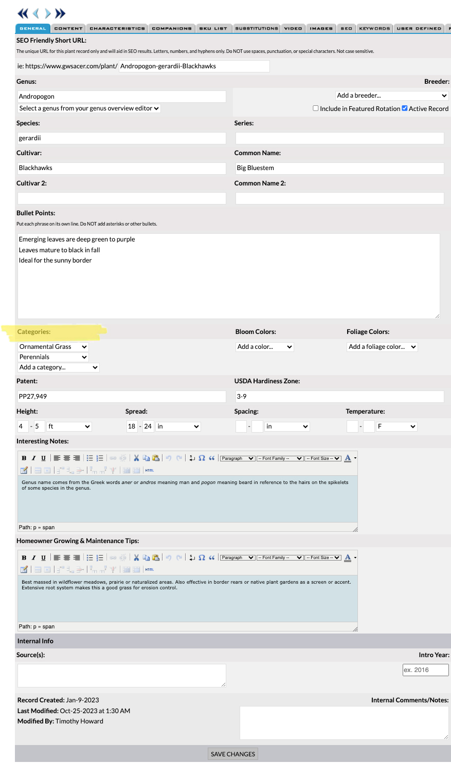 Organizing your plant records into categories like Annuals, Ferns, Ornamental Grasses, Perennials, Shrubs, Trees, etc. helps your website visitors find the types of plants they want to view and evaluate. You can put each variety in as many categories as needed. For example, you might want to put some varieties of grasses in both 'Ornamental Grass' and 'Perennials' and/or 'Native' (when applicable).
